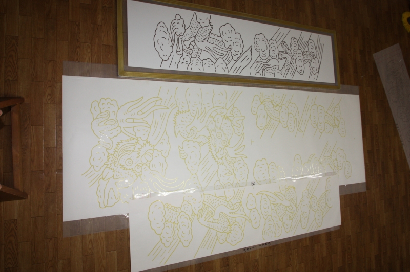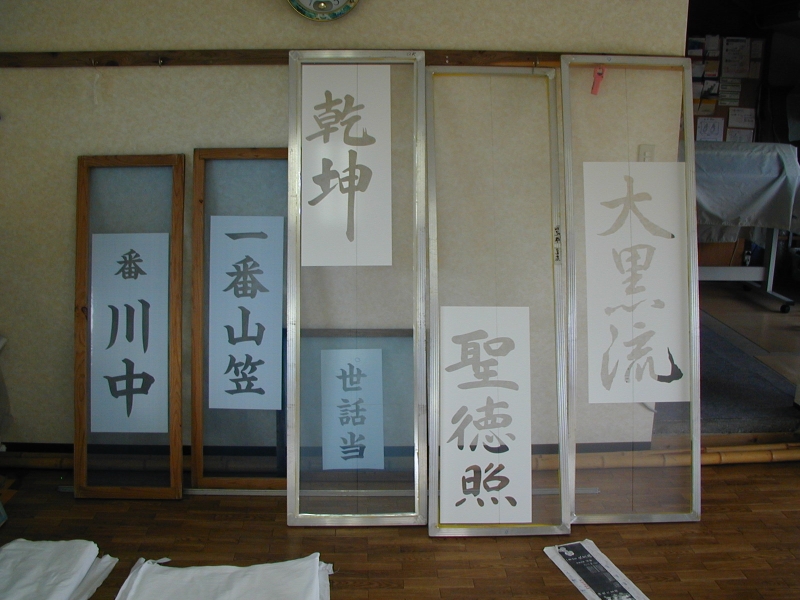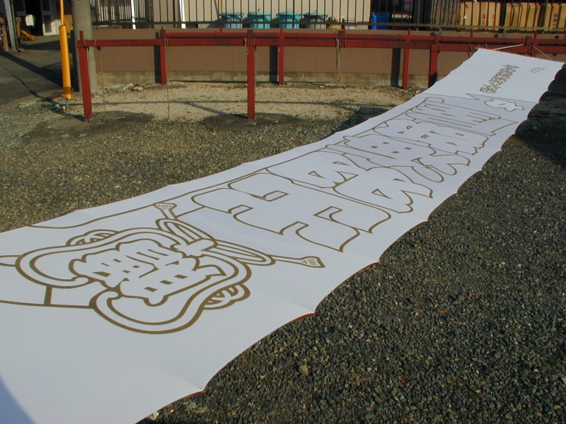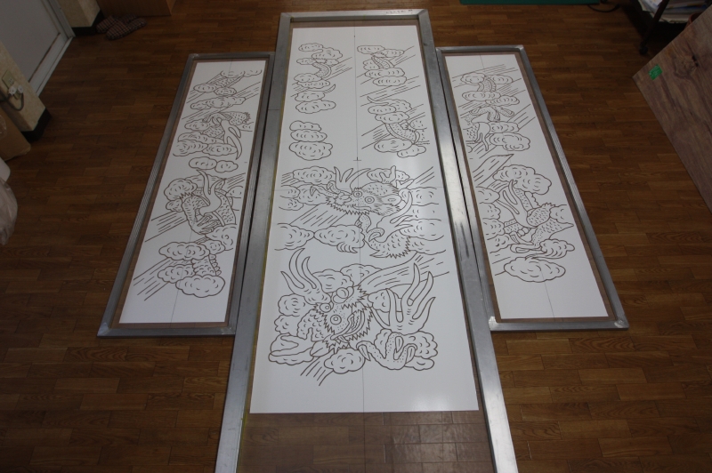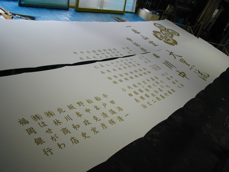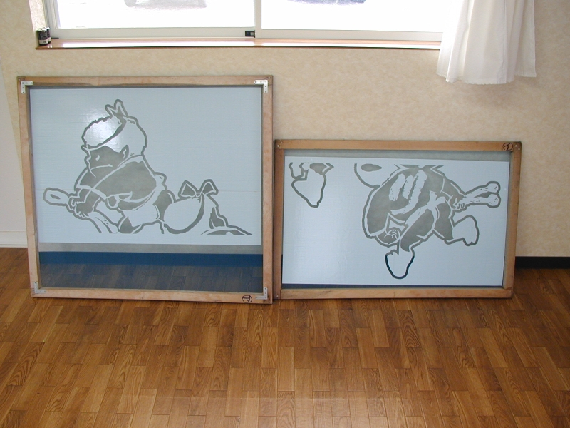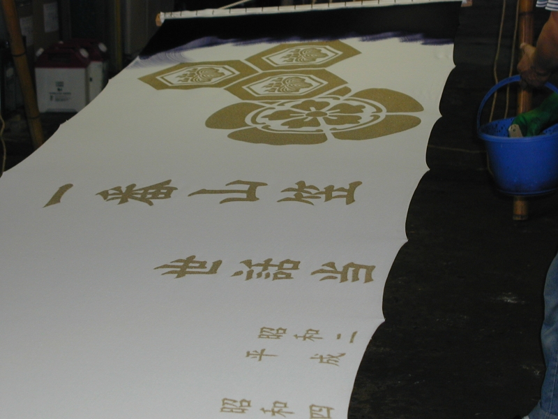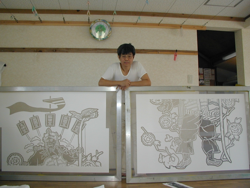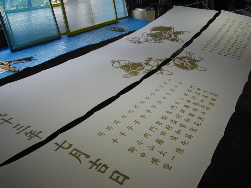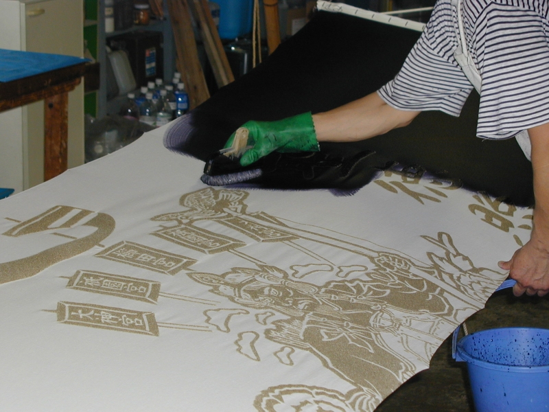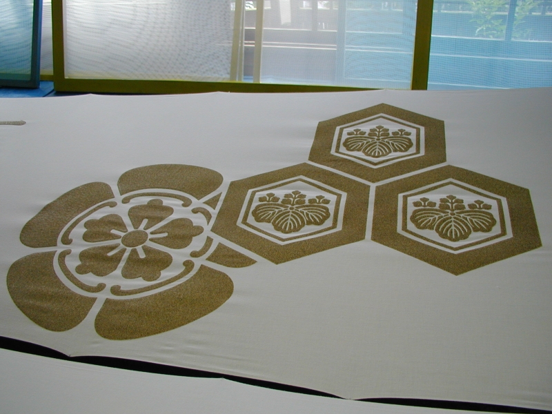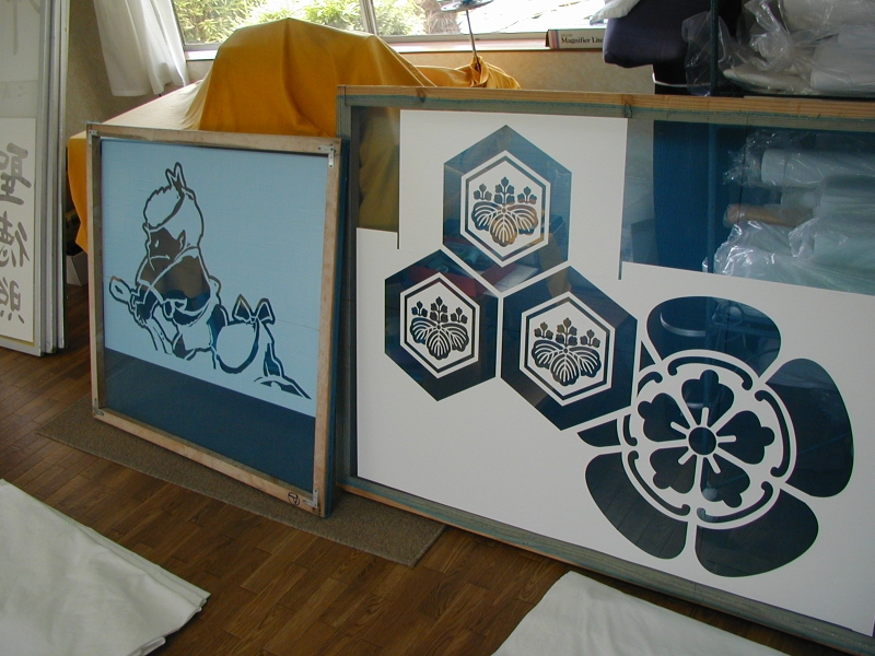 *型糊置・・・型枠に型紙を取り付けて型べらで防染糊を置く手法