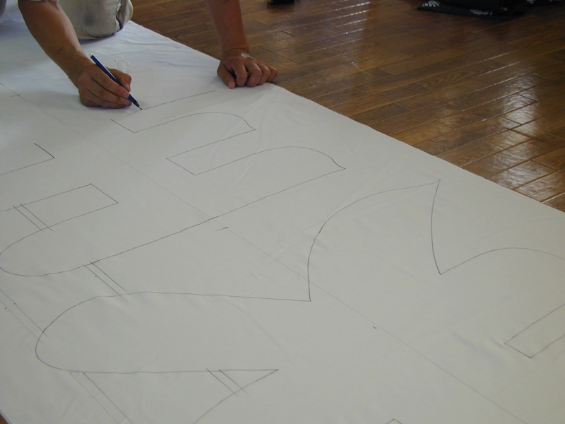 *筒引き・・・生地の上に直接、筒袋を用いて防染糊を置く手法